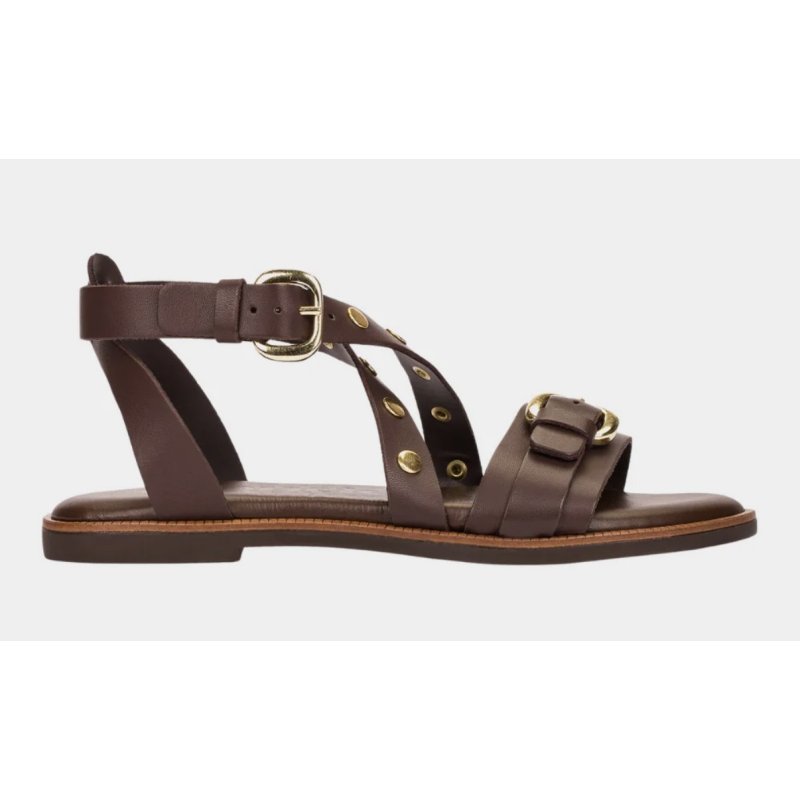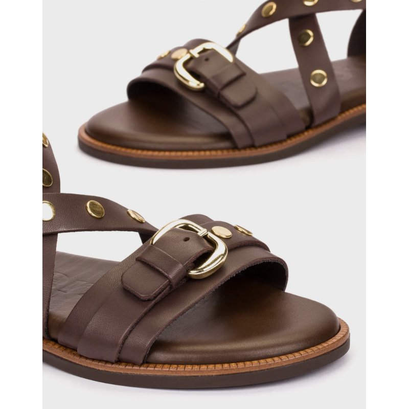 Flot sandal fra Wonders i mørkebrun skind, med kryds remme over foden. Flotte dekorative guldnitter på remmene, samt et lille spænde fortil på remmen, og omkring anklen, som åbnes og lukkes. Dejlig bløde såler.
