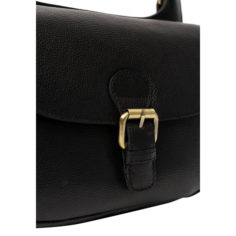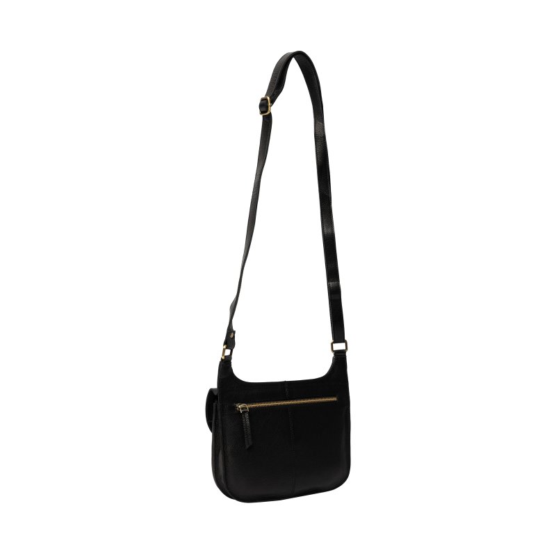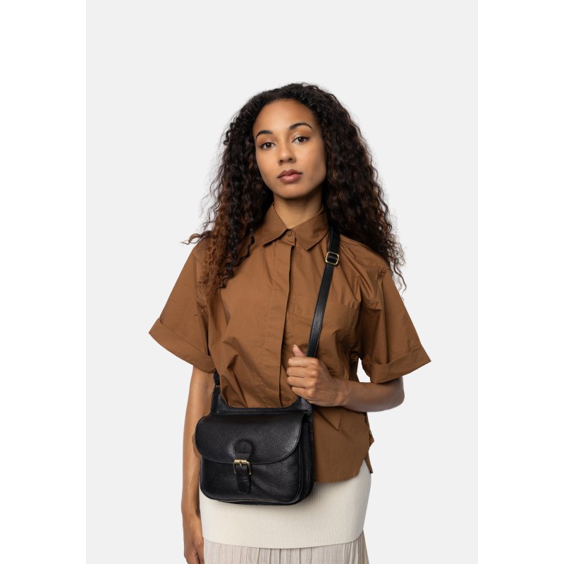 Super fin taske fra RE:DESIGNED i sort skind, med lang justerbar rem. Tasken lukkes med et lille tryk spænde, og har flere rum indvendigt.