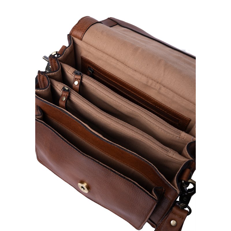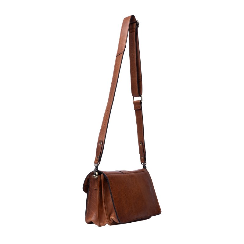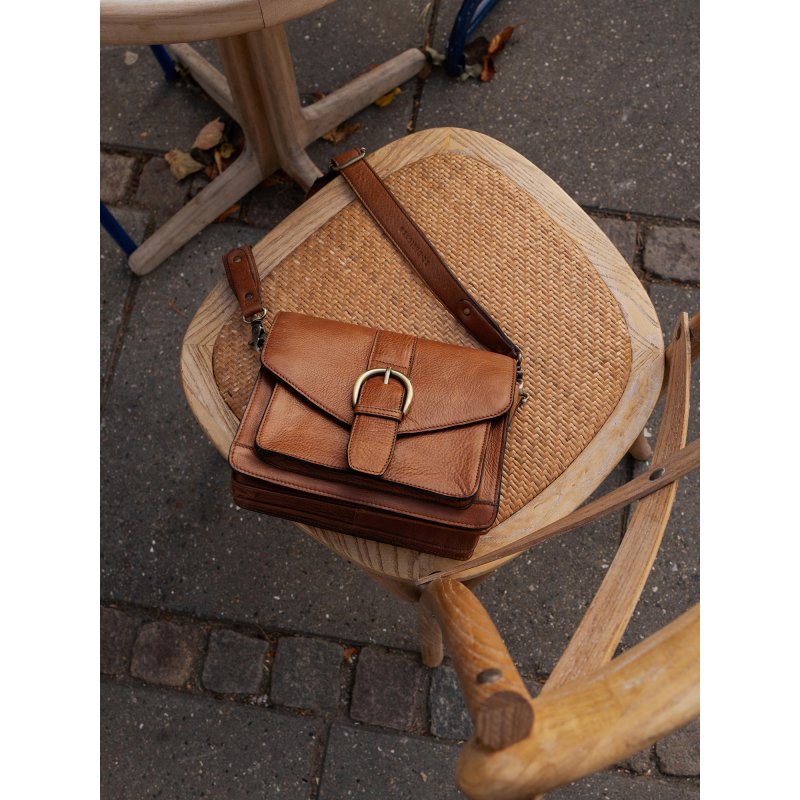 Meget smuk ny taske fra RE:DESIGNED i den flotte valnød skind. Tasken har et flot spænde fortil, på en magnet lukning. Indvendigt rummer tasken rigtig meget. Flere små rum der åbner sig, samt et lynlåserum i midten. Fantastisk taske der kan justeres i remmen alt efter hvor lang man ønsker den.