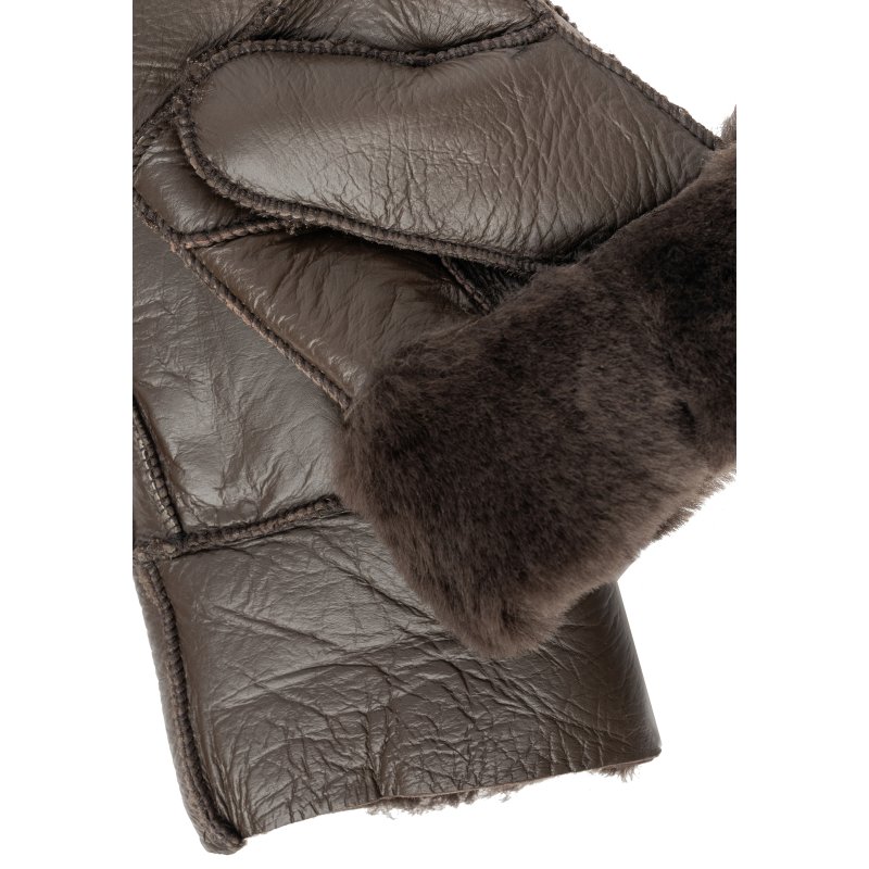 Skønne skindluffer i mørkebrun skind, med pelsfoer indvendigt. Øverste stykke af luffen kan foldes ned og op, så man får en detalje med pelskant