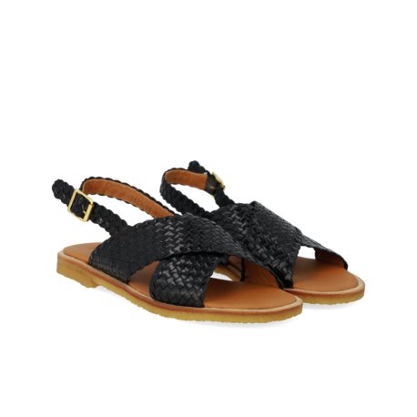 De populære skønne krydsrems sandaler fra Angulus, i håndflettet sort skind. Sandalen har rågummisåler og har en super god og blød komfort. Skindet former sig 100% efter ens fod, og er meget blødt.