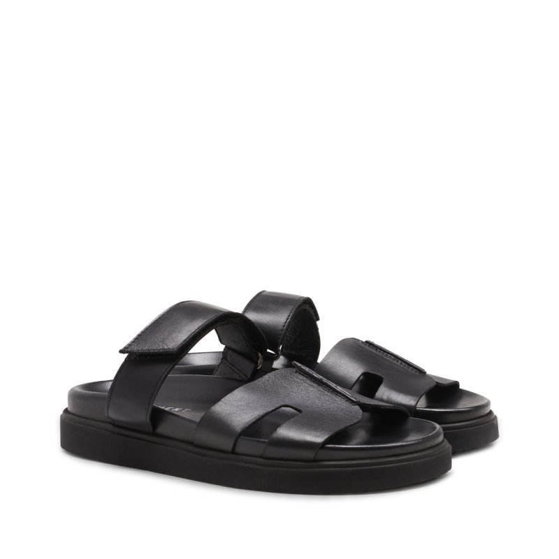 Lækre sandaler fra Pavement i sort skind. Sandalen har remme over foden, hvor den øverste justeres med velcro. Bløde såler med lækker fodseng.