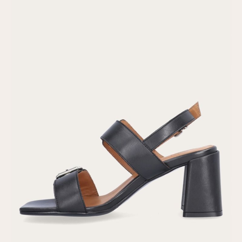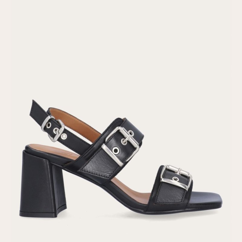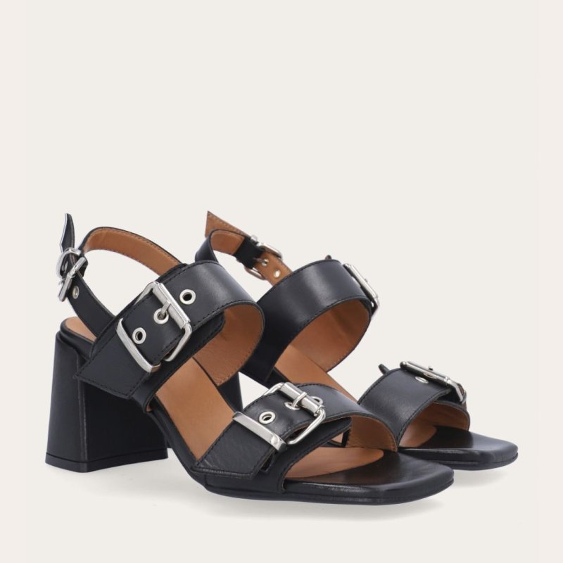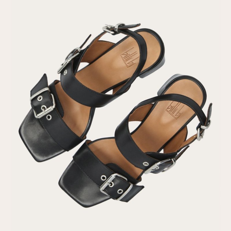 Meget smuk sandal fra Billi Bi i sort skind, med smarte sølvspænder på remmene over foden. Komfortabel og smart hæl på ca 7 cm, som er skindbetrukket.