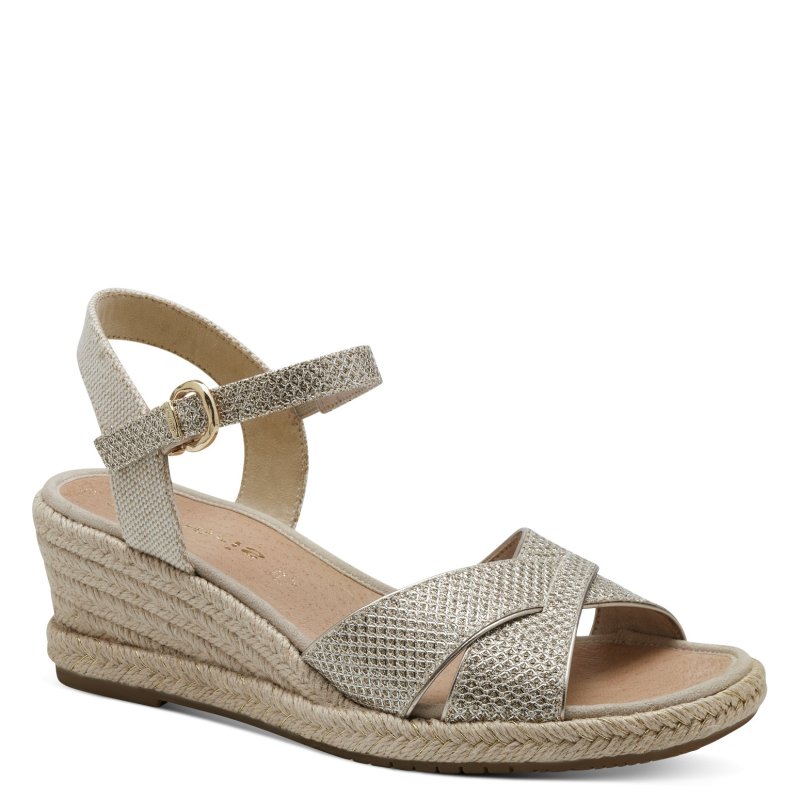 Meget lækker sandal fra Tamaris med kilehæl, og de blødeste såler. Sandalen er i et flot guldmateriale, og kan bruges til både hverdag og fest. Sandalen lukkes med et lille snyde velcro spænde.