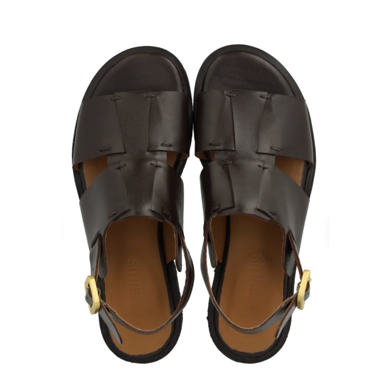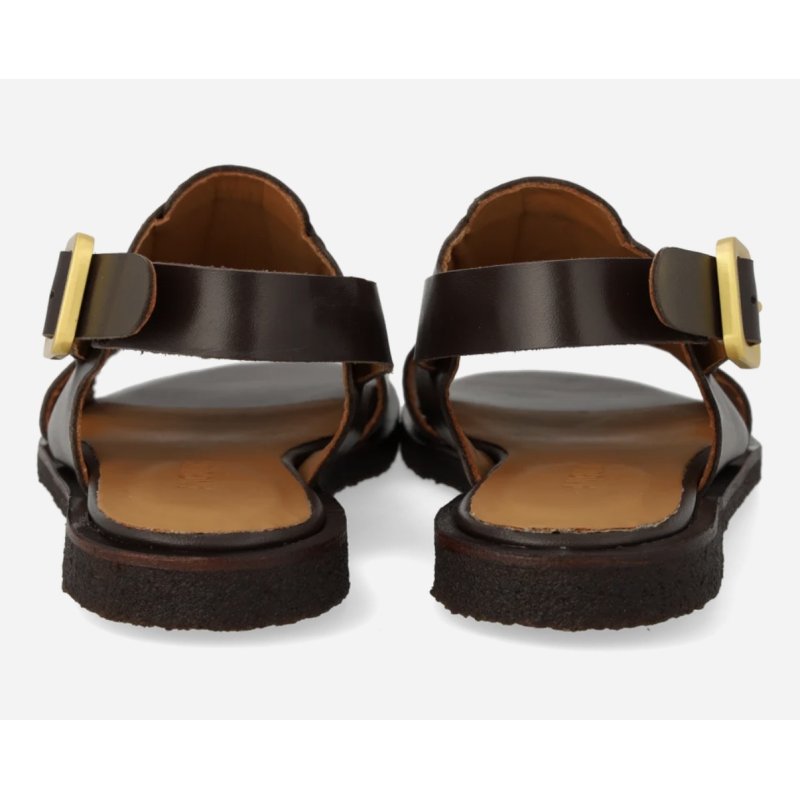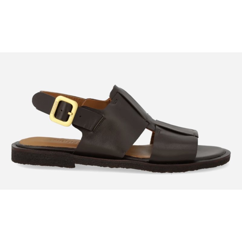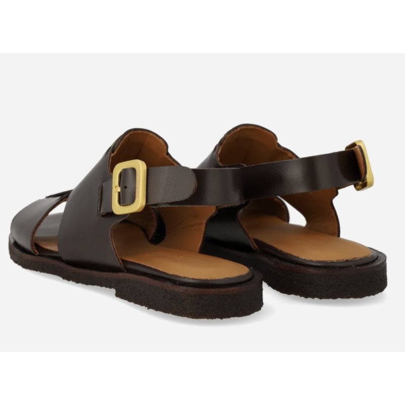 Meget lækker remsandal fra Angulus i mørkebrun skind. Sandalen har bløde rågummisåler, og vatteret indersåler. Skindforet som er i kromfrit læder. Sandalen lukkes bagom hælen, med et flot guldspænde.