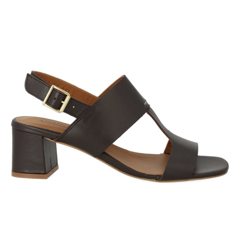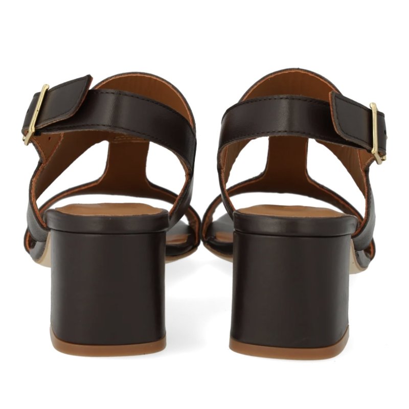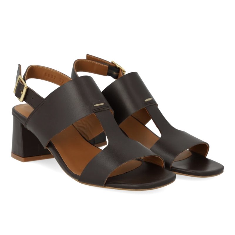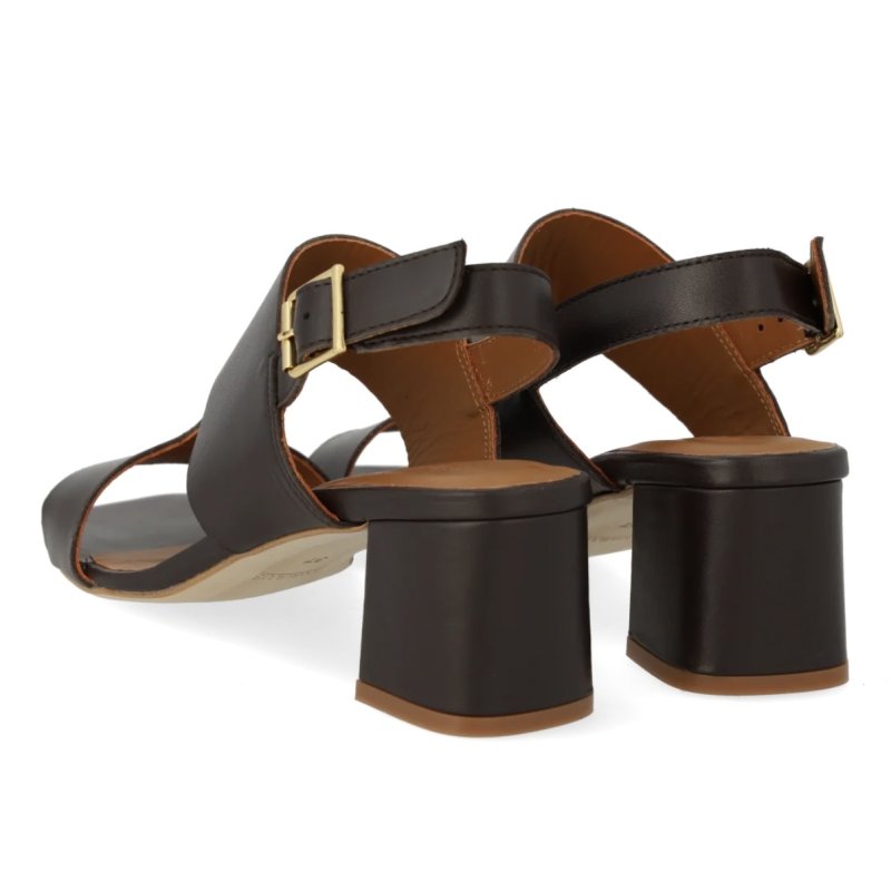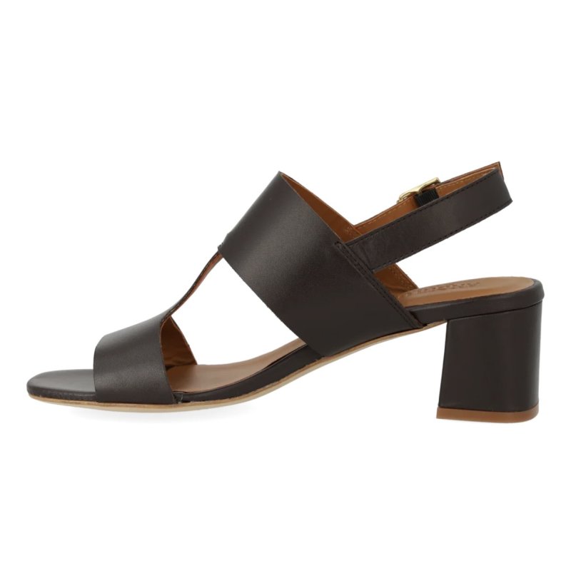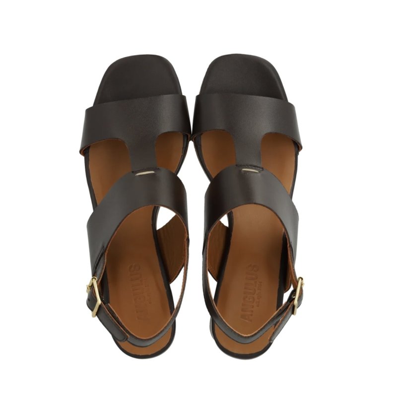 Flot og elegant sandal fra Angulus i mærkebrun skind, med en lille blokhæl. Sandalen Sandalen har remme fortil, og sidder godt fast på foden.