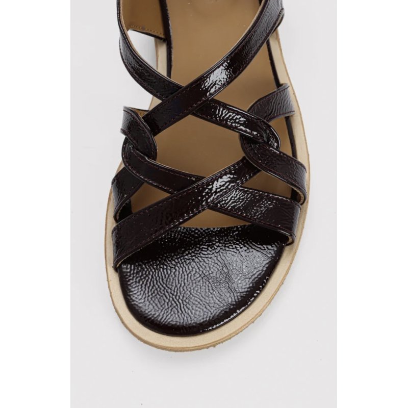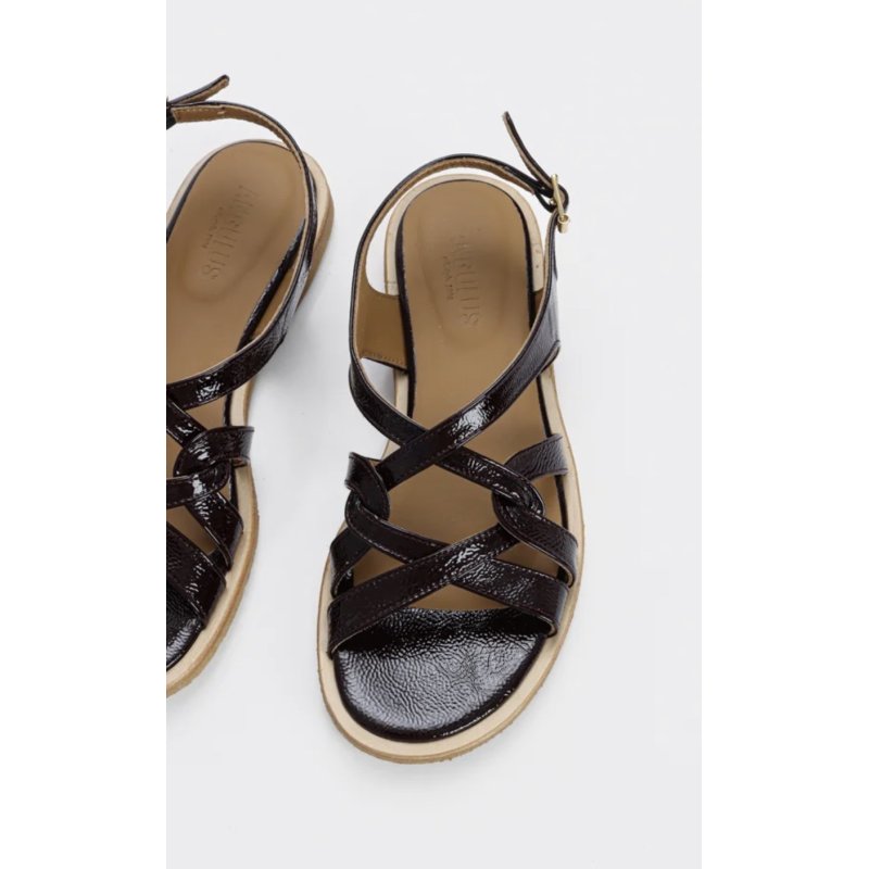 Rigtig fin elegant og samtidig komfortabel sandal fra Angulus. En flot farve mørkebrun lakskind, og de fineste tynde remme, som gør sandalen feminin. Sidder helt fantastisk på foden.