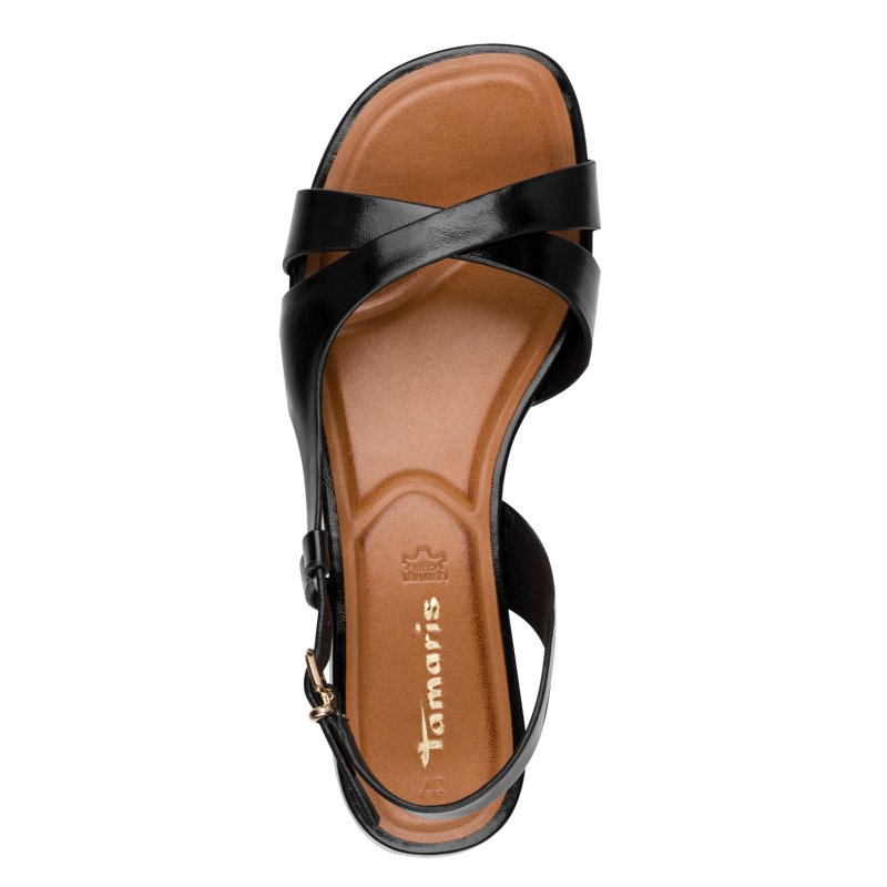 Super sød og elegant sandal fra Tamaris i virkelig flot sort skinnende materiale. Sandal har krydsrem fortil og en justerbar rem omkring hælen
