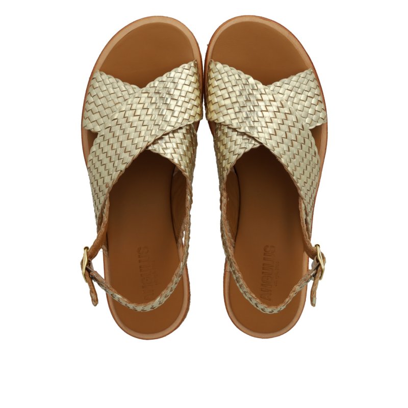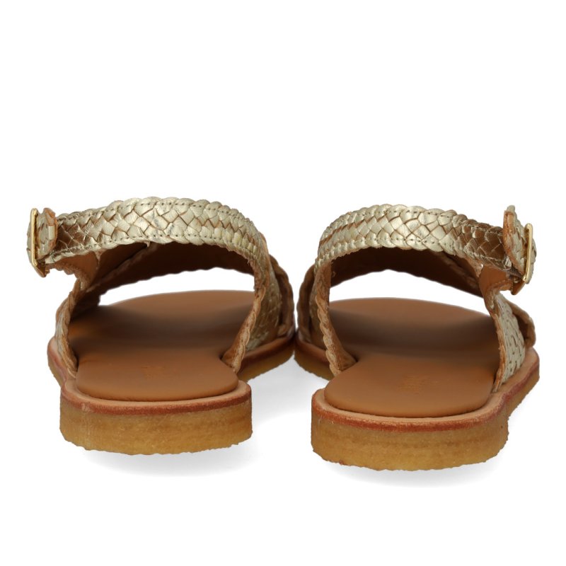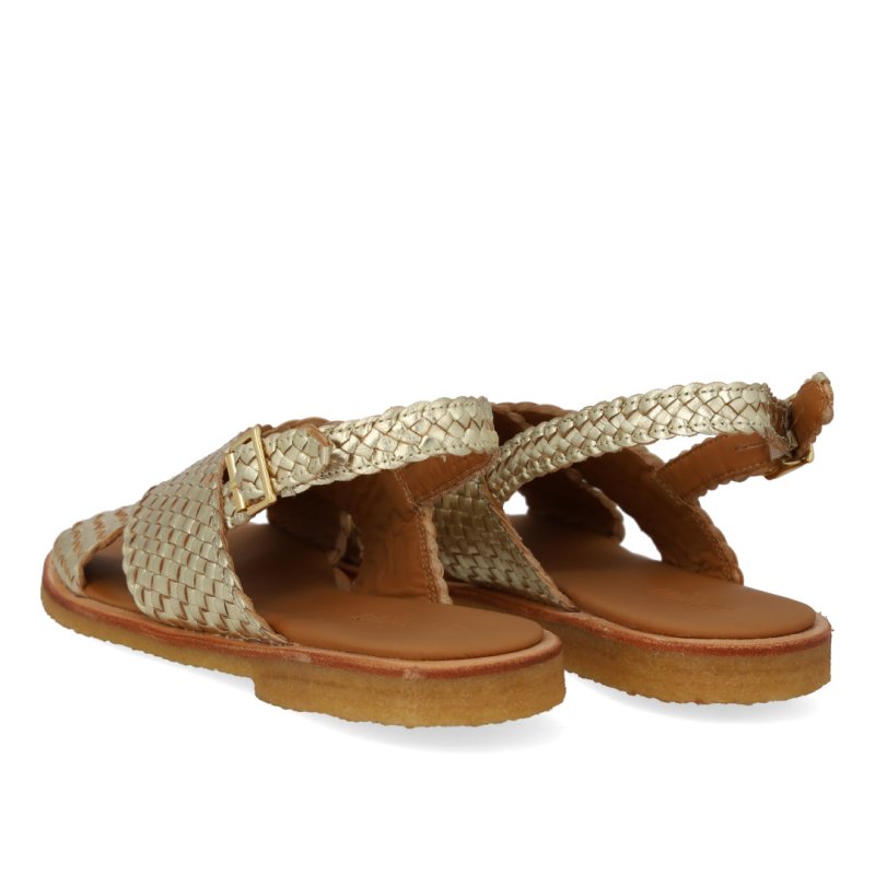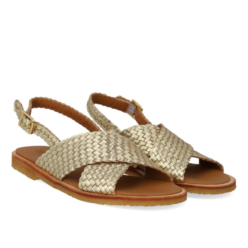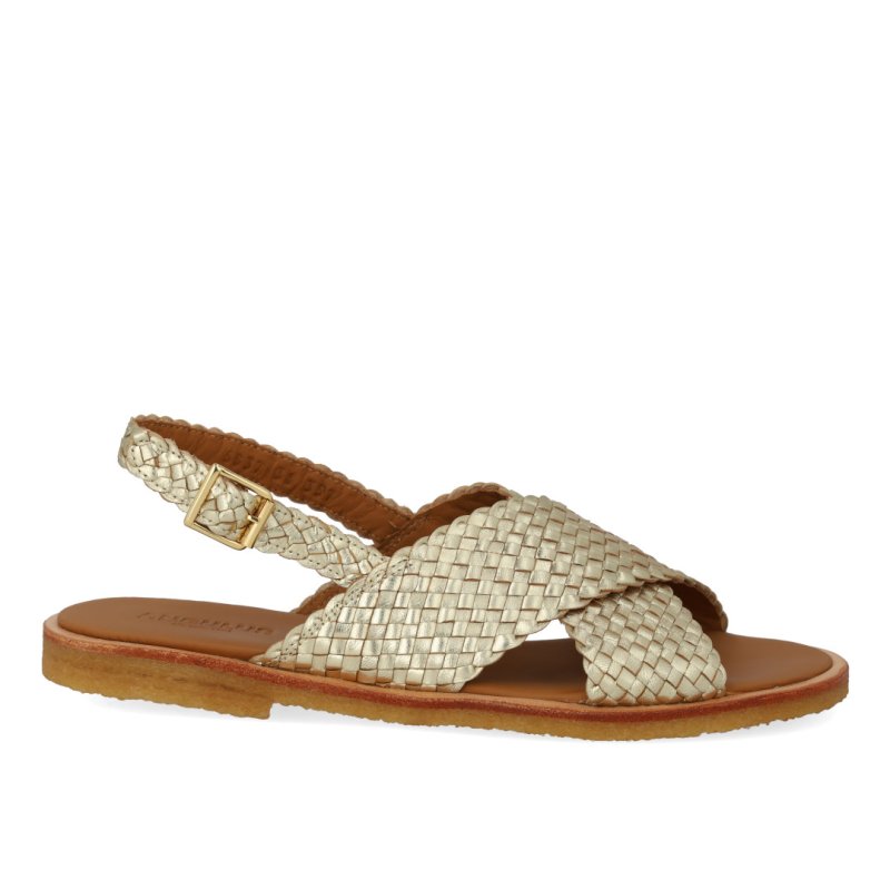 Lækker blød sandal med rågummisåler i flettet guld skind. Sandalen har en bred krydsrem over foden som passer til alle fødder og sidder godt på foden. Perfekt til sommer