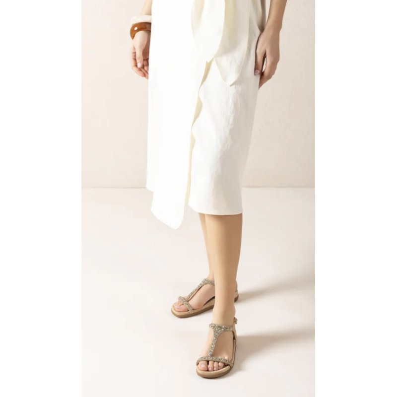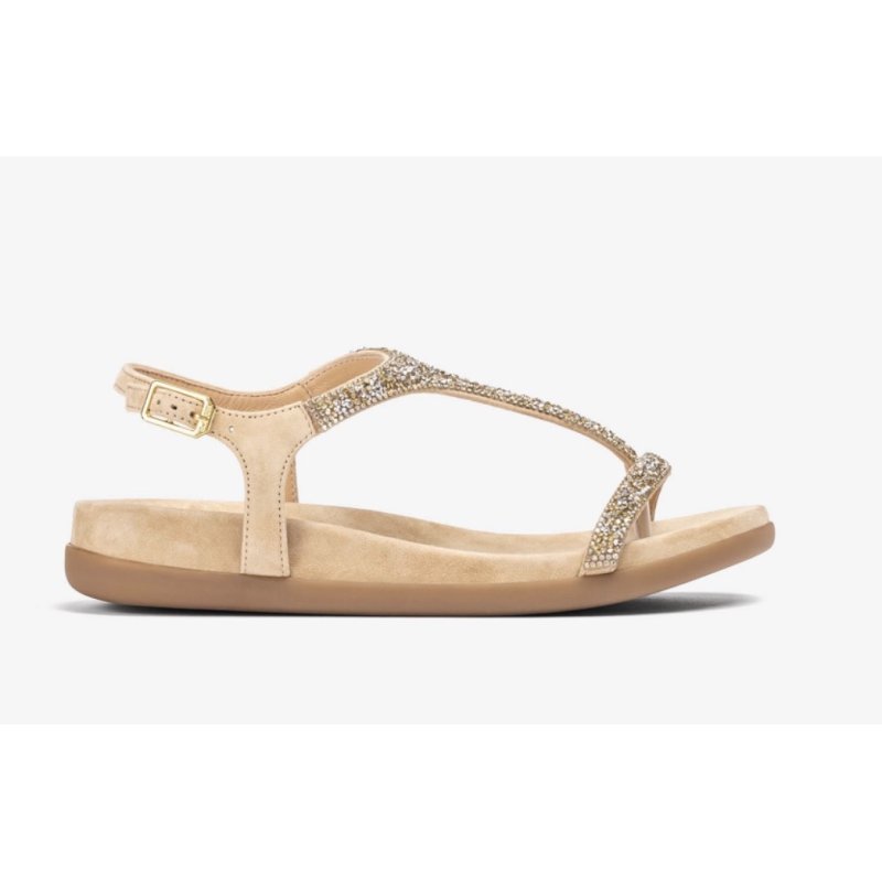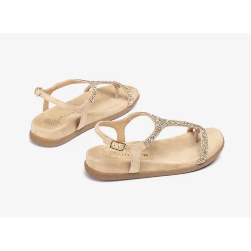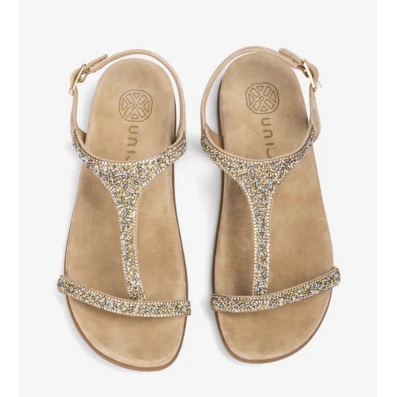 Unisa sandal der både er rigtig fin, men samtidig super komfortabel. Sandalen er i lys sandfarvet ruskind, bløde såler og med remme i glitter, samt en lille tåsplit.