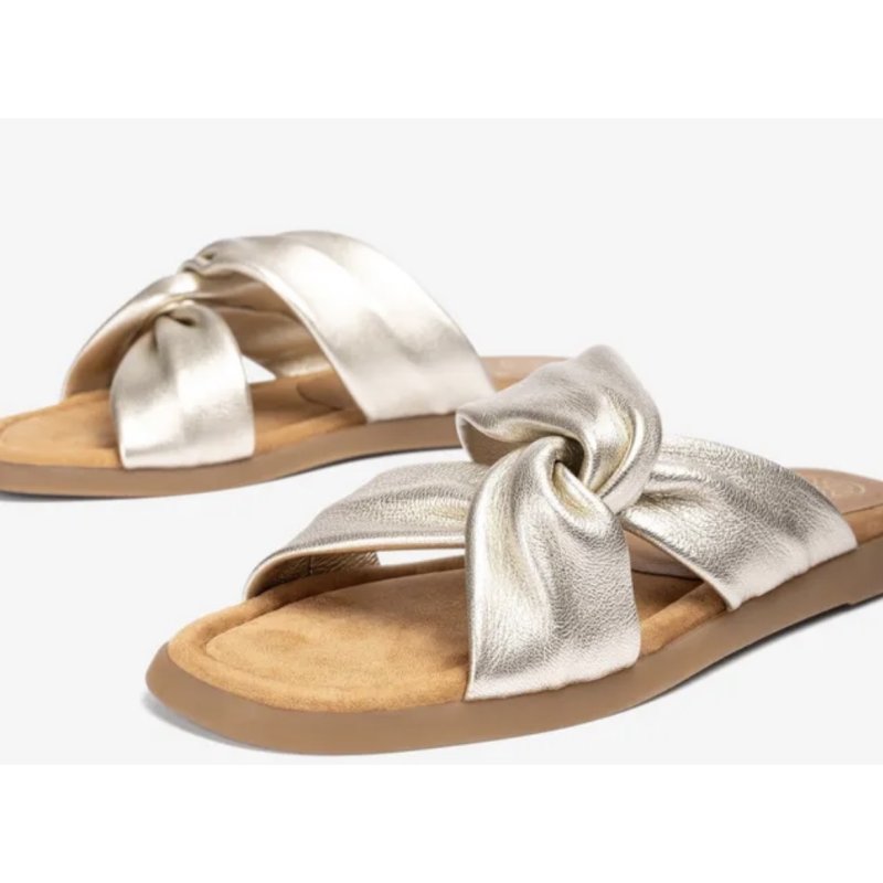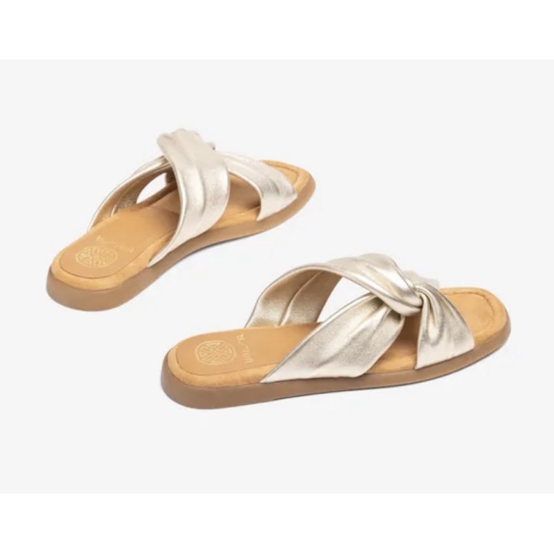 Lækre slip in sandaler fra Unisa i den flotteste guld skind. Sandalen har de skønneste bløde såler, og en fantastisk komfort!