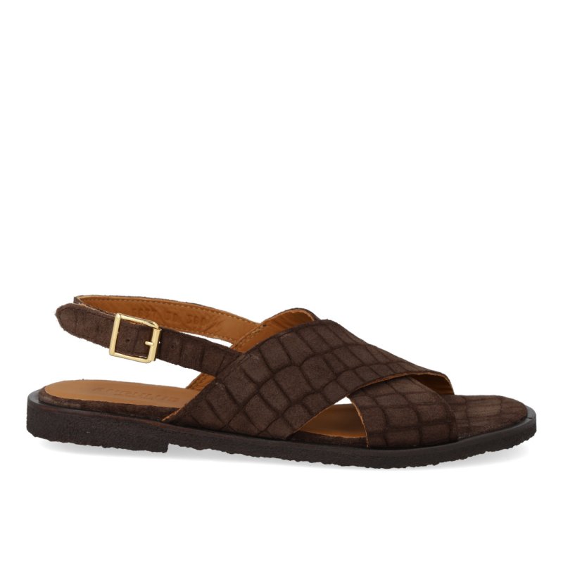 Lækker blød sandal med rågummisåler i mørkebrun crocopræget ruskind. Sandalen har en bred krydsrem over foden som passer til alle fødder og sidder godt på foden. Perfekt til sommer