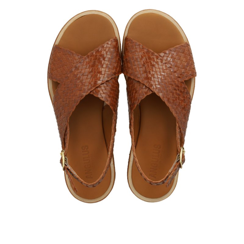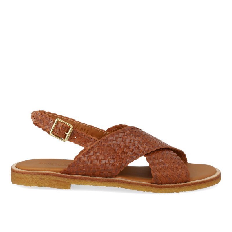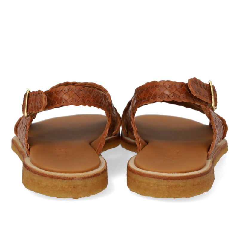 Lækker blød sandal med rågummisåler i flettet skind i farven tan. Sandalen har en bred krydsrem over foden som passer til alle fødder og sidder godt på foden. Perfekt til sommer