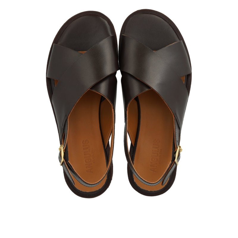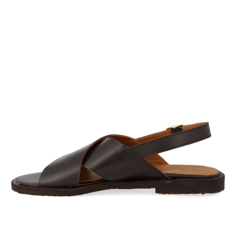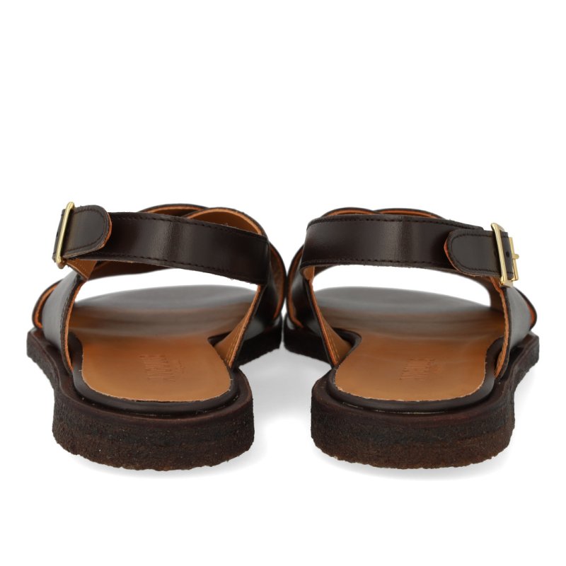 Lækker blød sandal med rågummisåler i mørkebrun skind. Sandalen har en bred krydsrem over foden som passer til alle fødder og sidder godt på foden. Perfekt til sommer