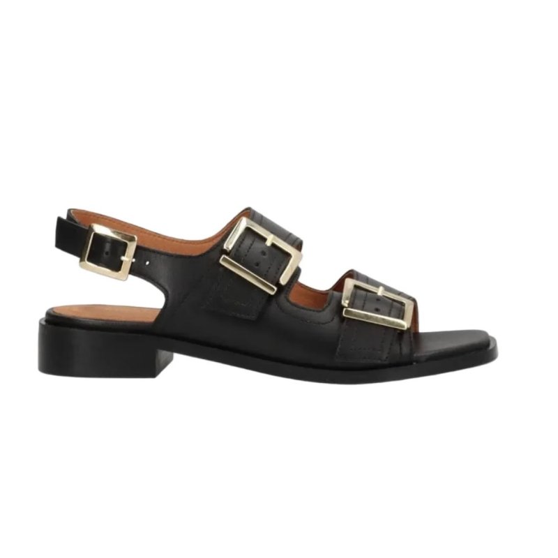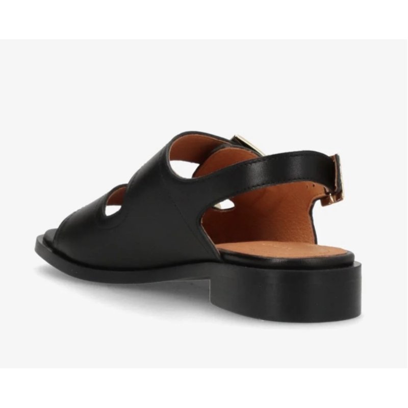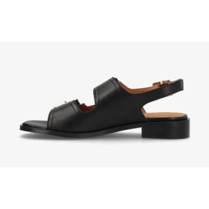 Elegant sandal fa Phenumb i sort skind, med to remme over foden, med justerbar flotte guldspænder.