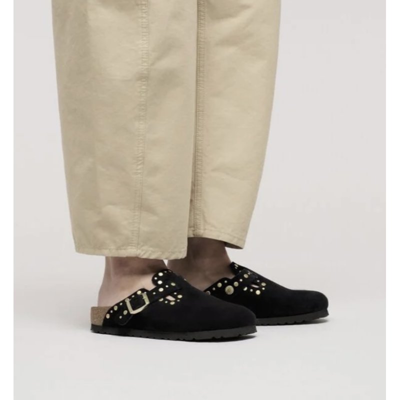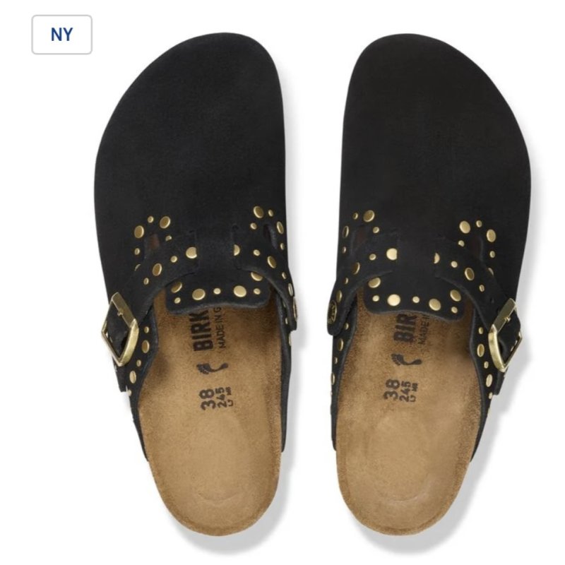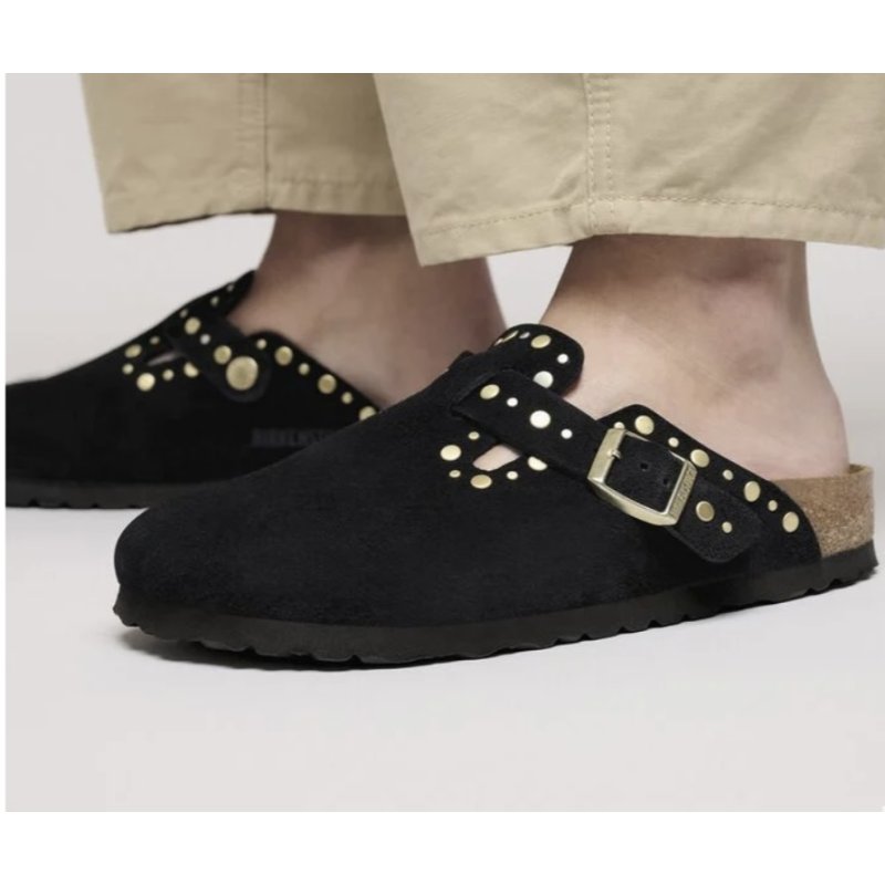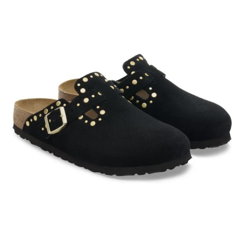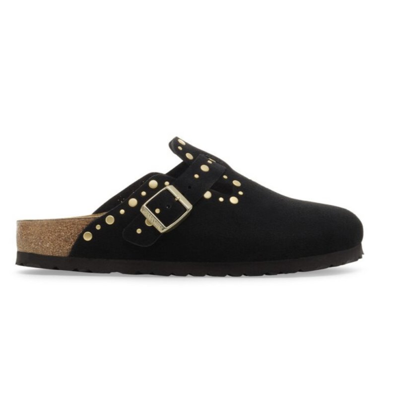 Den populære Birkenstock Boston modellen, i en helt ny moderne udgave! I den flotte dorte ruskind, med fine nitte detaljer i guld. Giver et fantastisk udtryk. Denne model er med almindelig såler. .