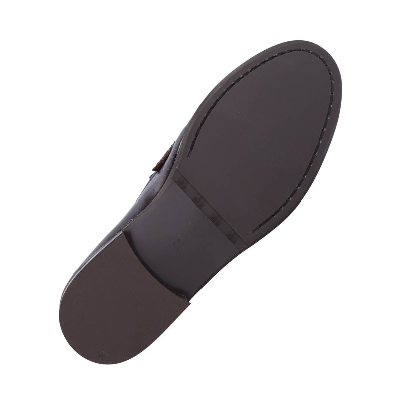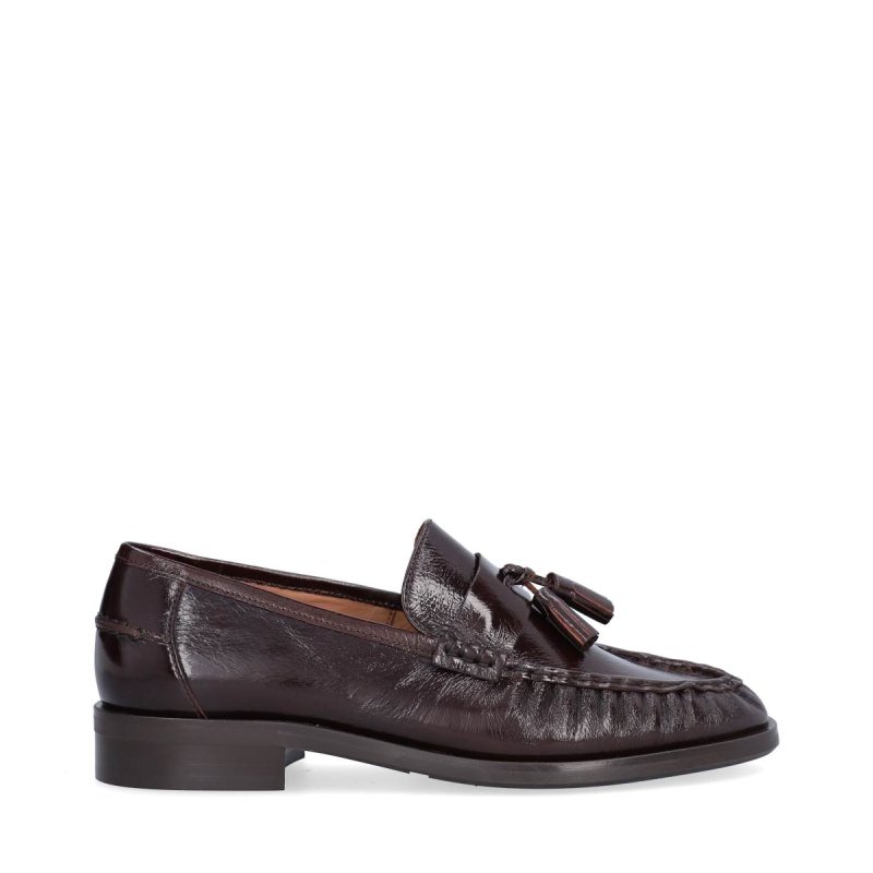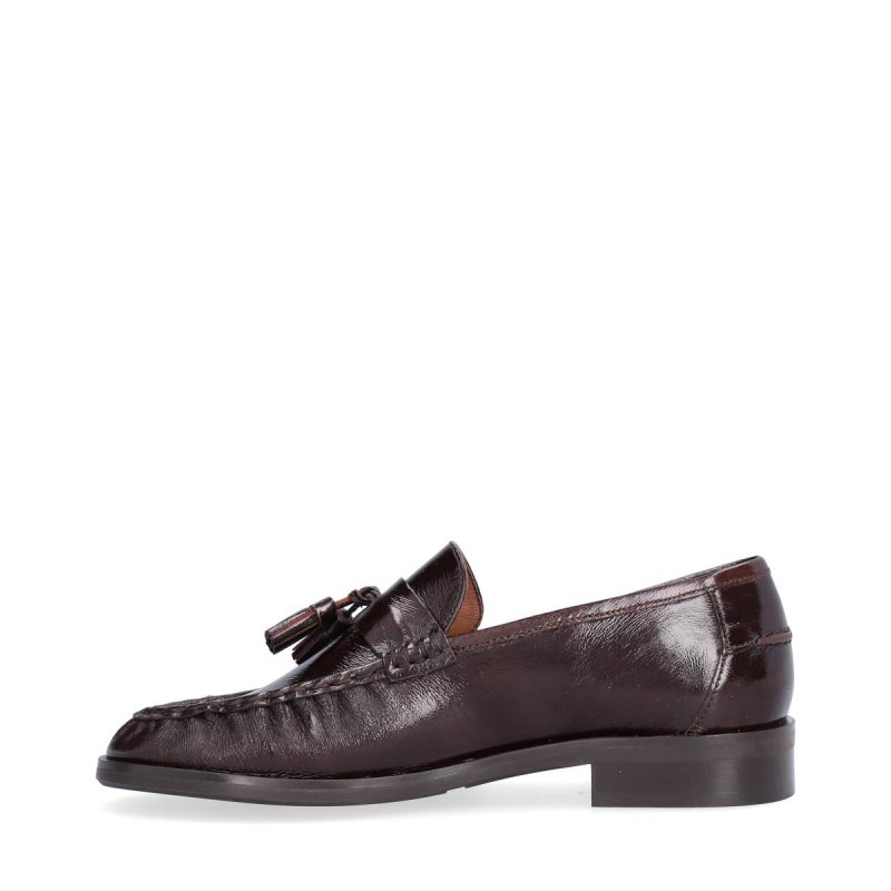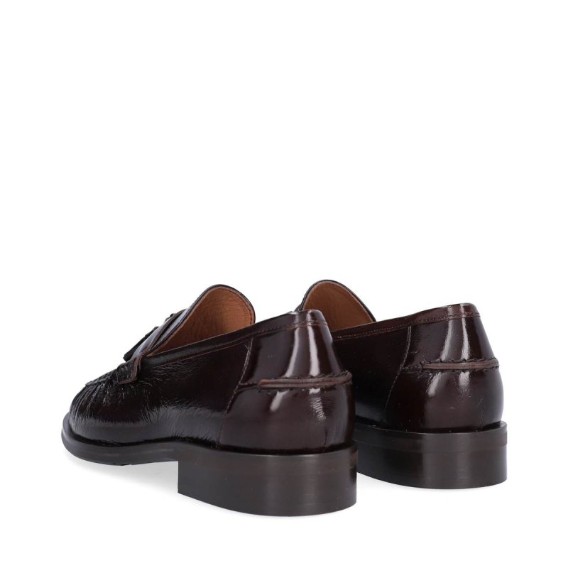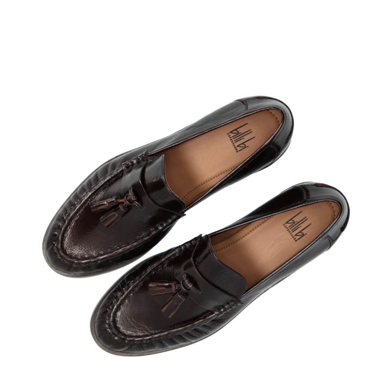Meget fin og moderne håndlavet loafer fra Billi Bi, lavet i en meget flot mørkebrun lakskind med rund tå. Skoen er dekoreret med en simpel strop henover fronten og to kvaster, samt en markeret stikning, hvor skindet danner en let rynkning, der giver meget fine detaljer.