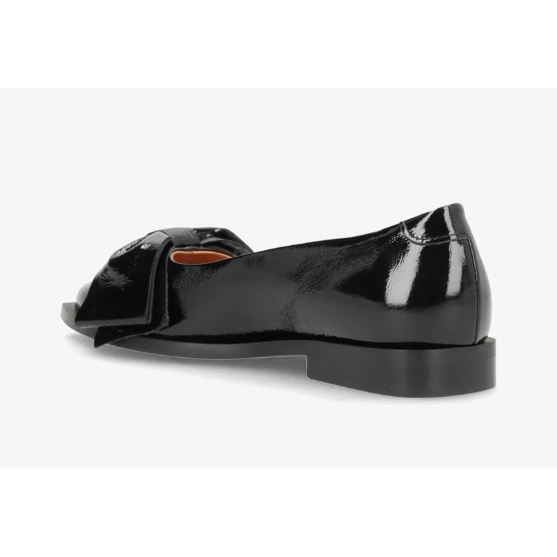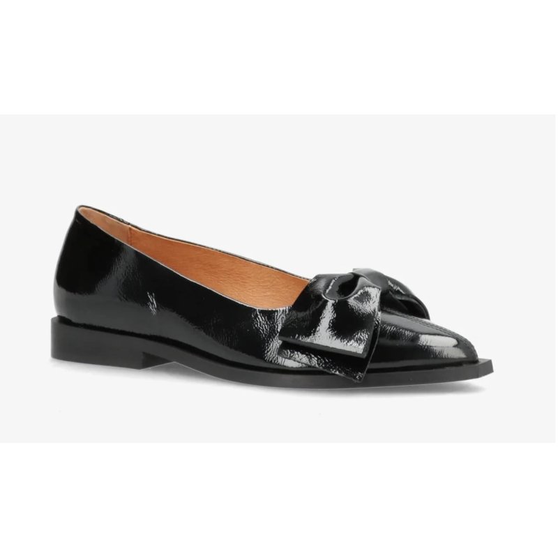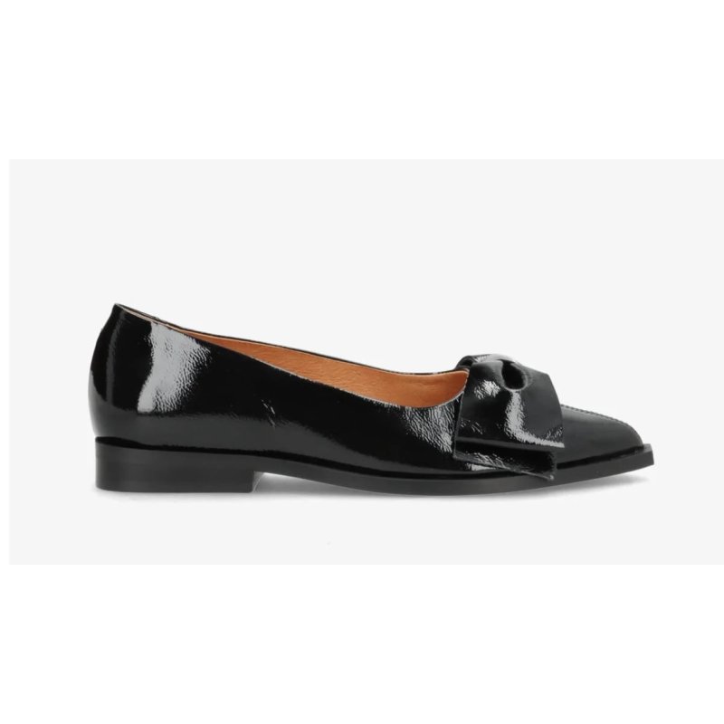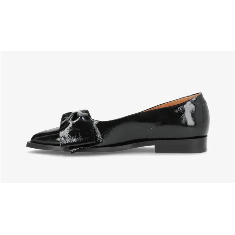 Meget smuk og elegant ballerina sko fra Phenumb, i sort lakskind med en dekorativ sløjfe fortil. Skoen sidder rigtig godt på foden, og har en super komfort.