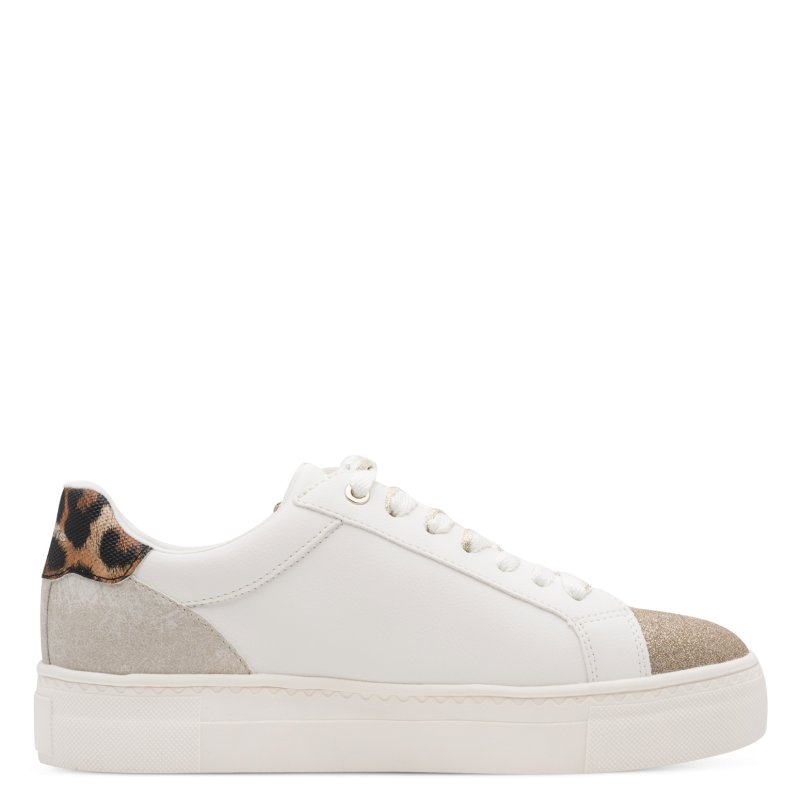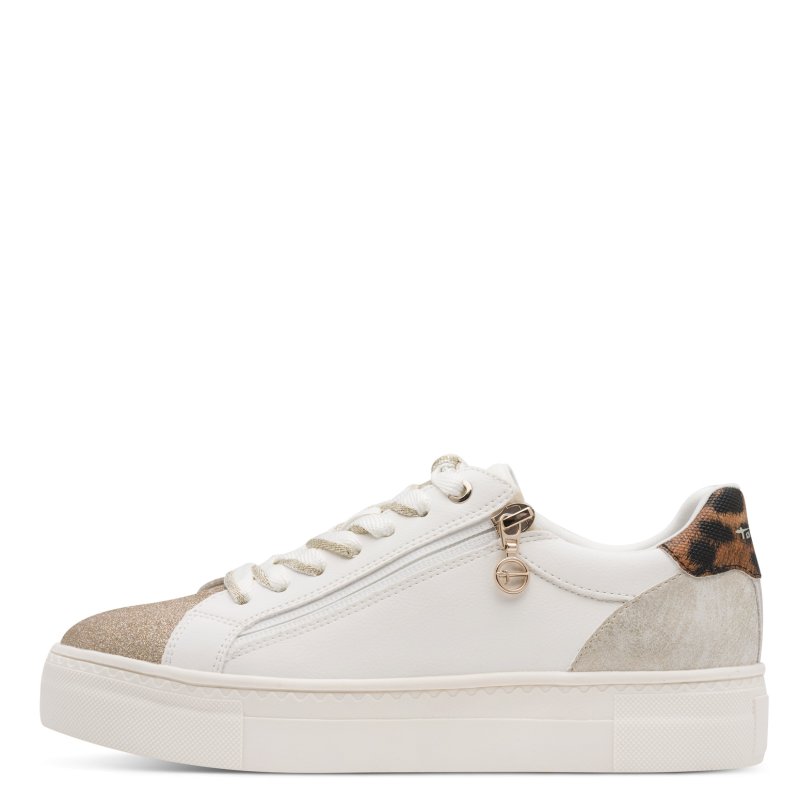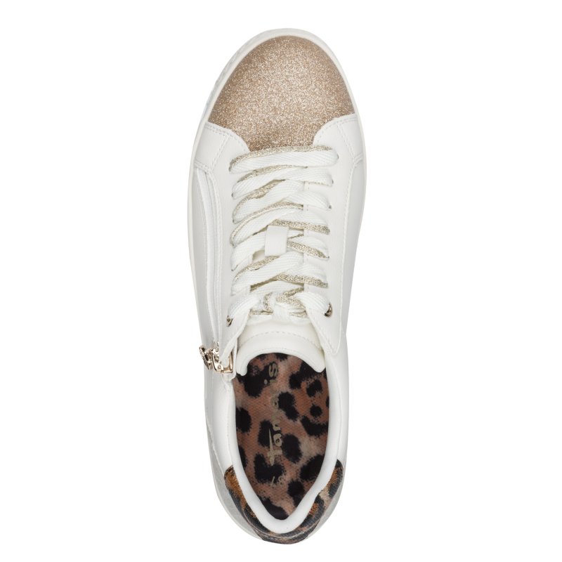 Smart sneakers fra Tamaris i hvid, med fine glitter detaljer på, samt en leo detalje bagpå. Snøre fortil, samt en lynlåse i siden.