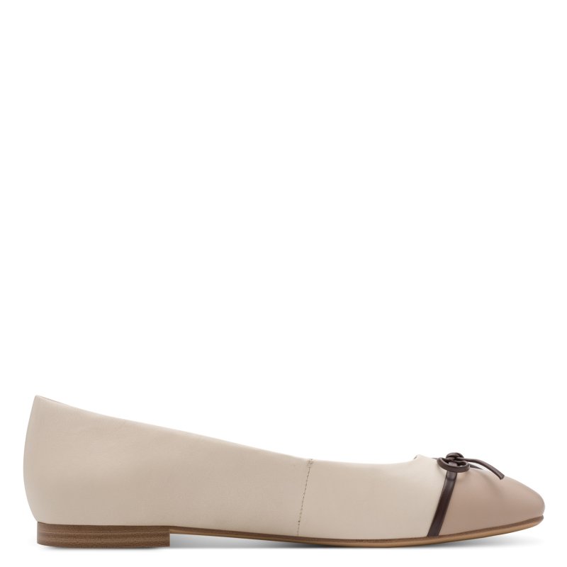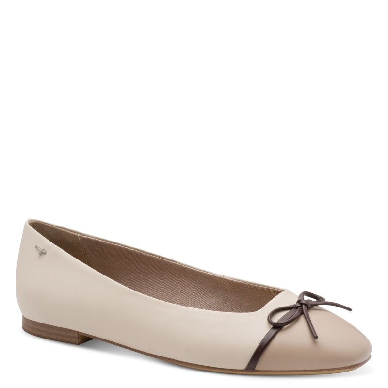 Meget smuk ballerina sko fra Tamaris, i de flotteste lyse kombinationer, med en mørkebrun skindsløjfe fortil. Passer perfekt til både lyst tøj, og mørkt samt mørkebrun.