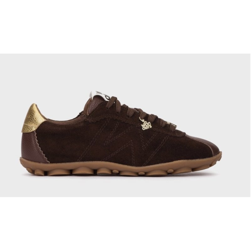 Super smart og moderne sneakers fra Wonders, med flade såler. Skoen er i mørkebrun ruskind, med skind detaljer, samt guld bagpå. Lækker blød komfort.