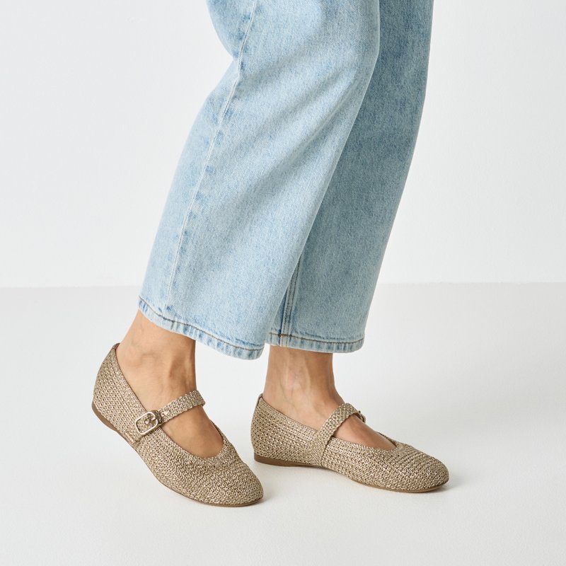 Meget fin ballerina sko fra Tamaris, i guld. Skoen er i lidt netagtigt stof, og foret på indersiden. Rem over foden, der kan justeres. Super bløde og behagelige at have på.