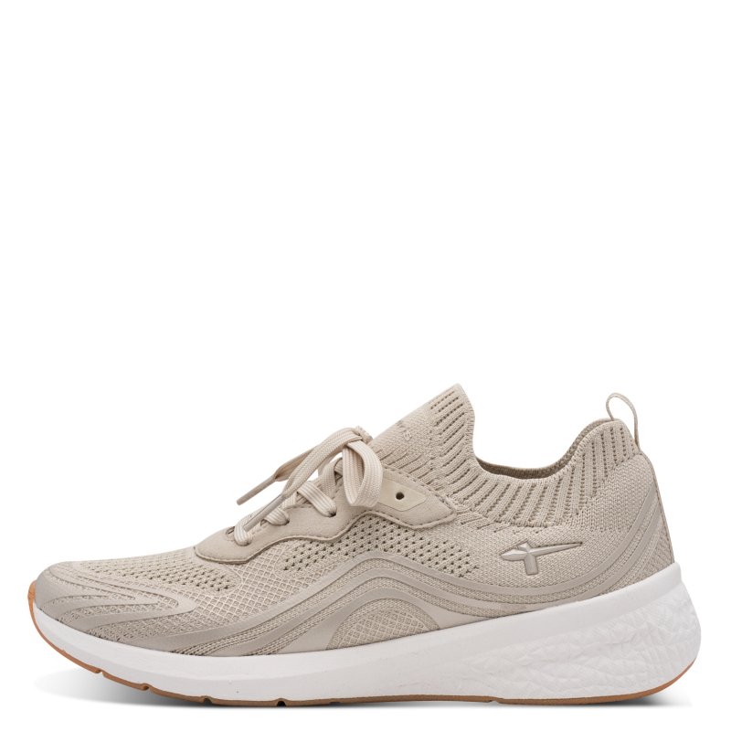 Meget blød og komfortabel sneakers fra Tamaris i beigetekstil stof. Meget strækbar, og former sig fuldstændig efter foden.
