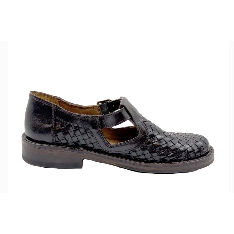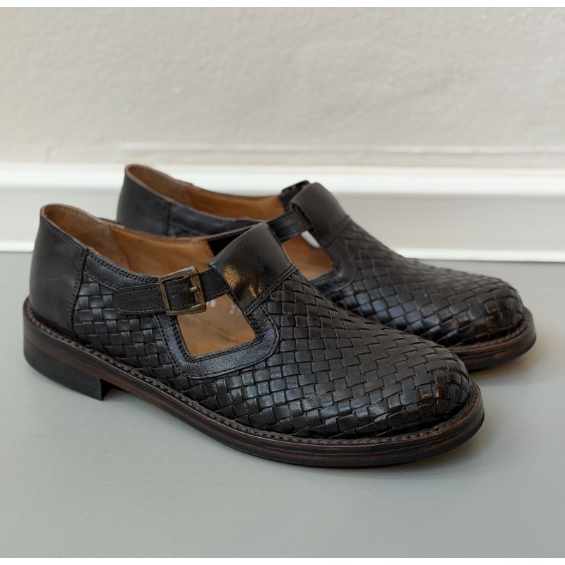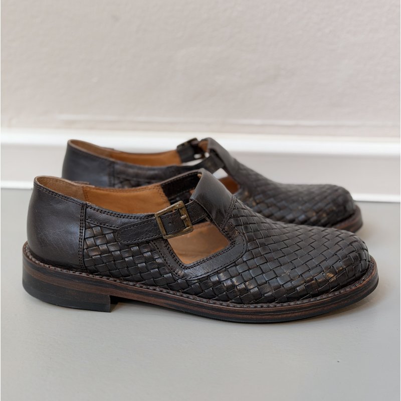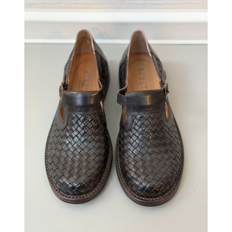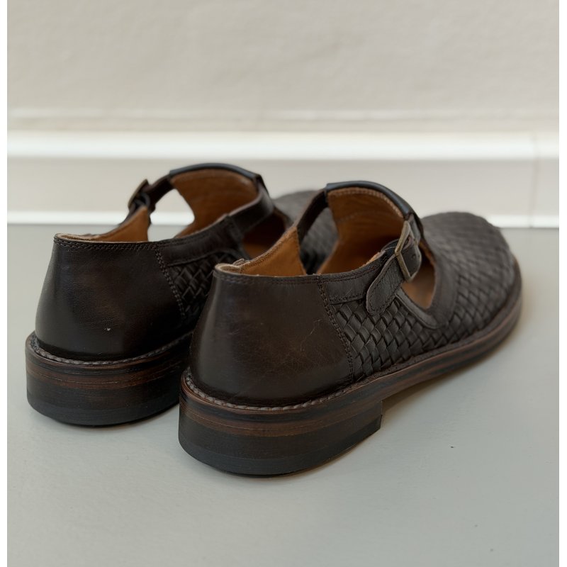 Meget flot og elegant Bubetti sko, i den flotte mørkebrun skind. Skoen er håndflettet, og har eet t-rem fortil, med en lille spænde. Skoen er super fed til både kjoler og bukser, og kan bruges både med og uden en smart strømpe.