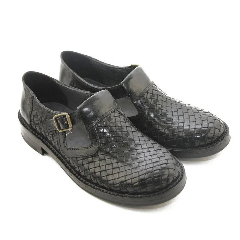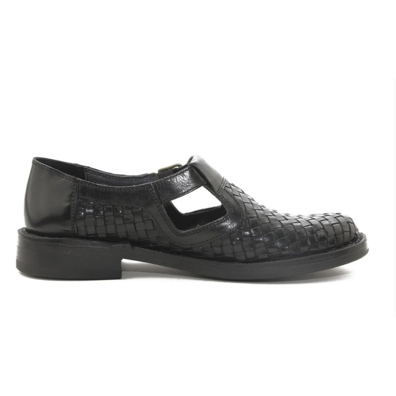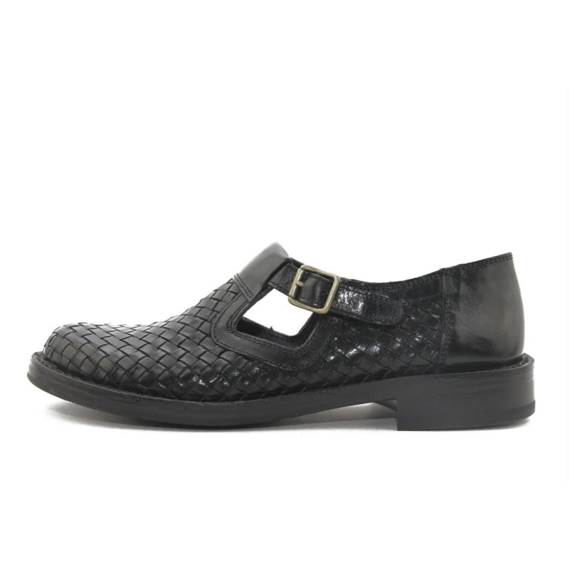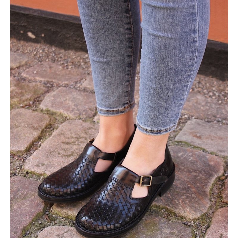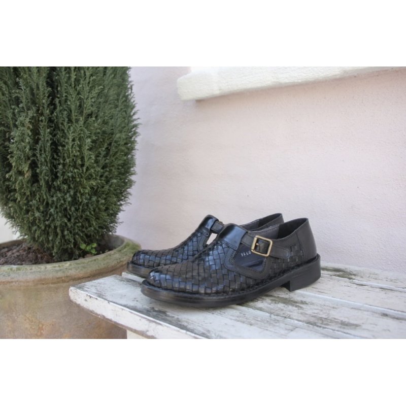 Meget flot og elegant Bubetti sko, i sort skind. Skoen er håndflettet, og har eet t-rem fortil, med en lille spænde. Skoen er super fed til både kjoler og bukser, og kan bruges både med og uden en smart strømpe.