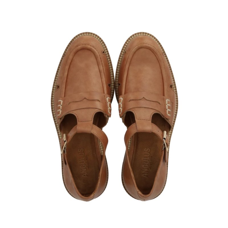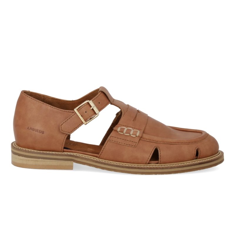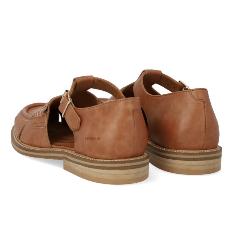 Lækker sko fra Angulus i cognac skind. Skoen er både lidt åben og lukket, og kan bruges med både strømper og bare fødder. Super lækker komfort.