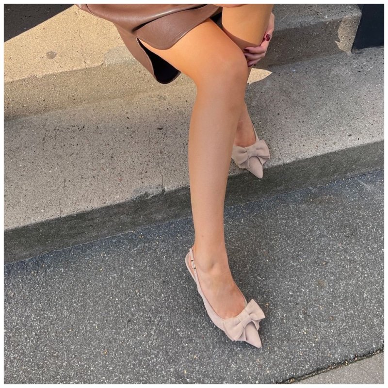 Meget elegant sling back pumps fra Copenhagen Shoes, i den smukke lyse ruskind. Skoen har en spids snude, og en flot sløjfe fortil.