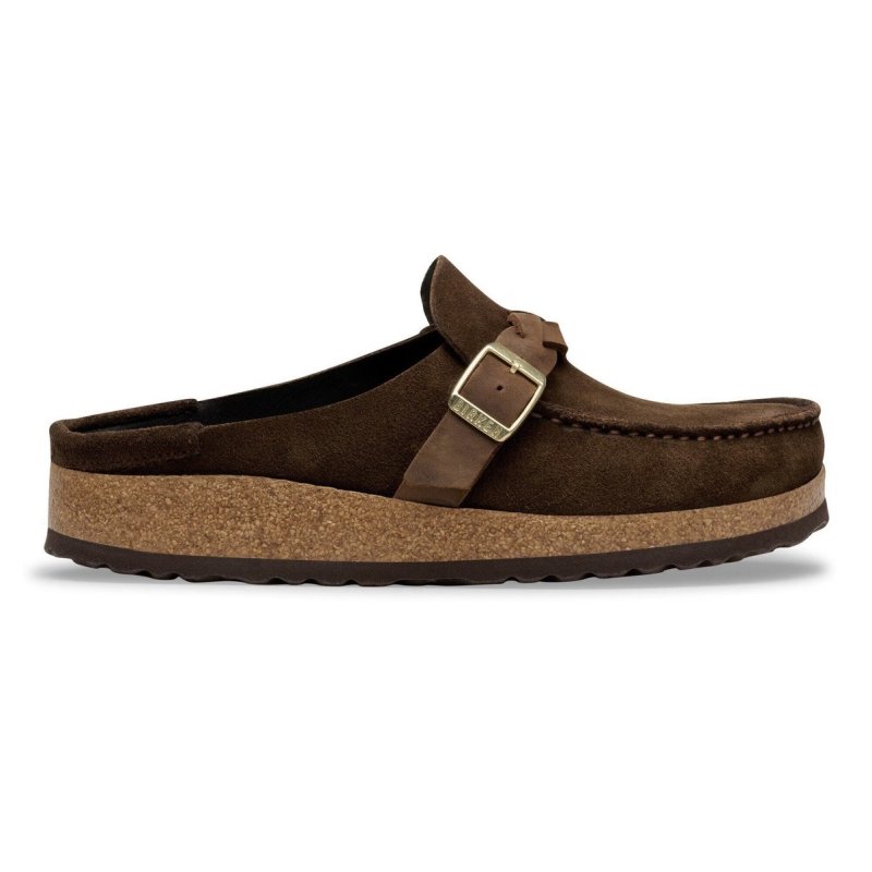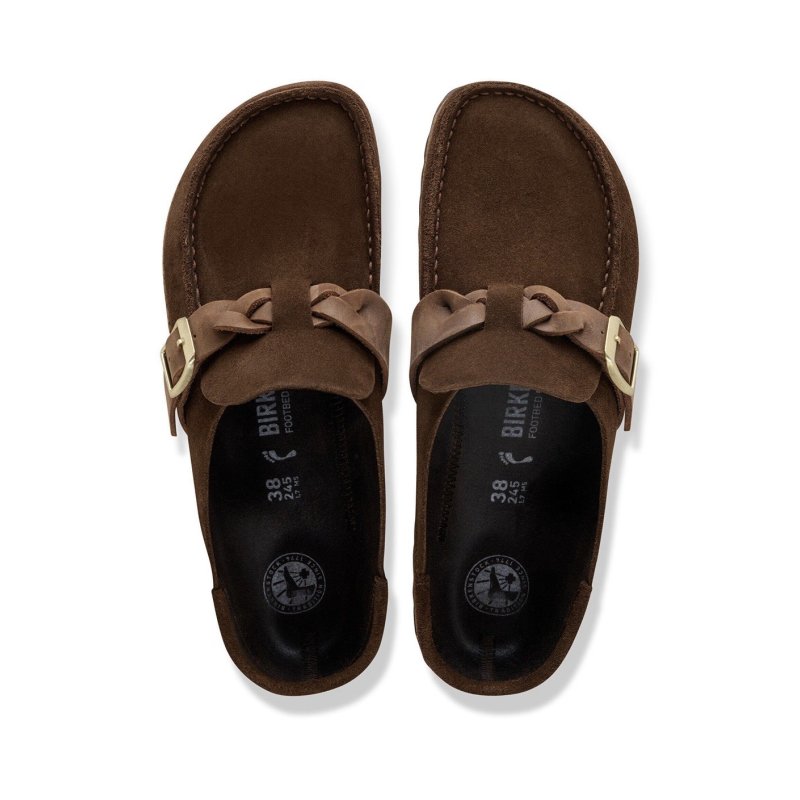 En fed lukket slip in sko fra Birkenstock i en flot mørkebrun ruskind. Sålerne er de velkendte såler, med anatomisk rigtig svangstøtte. Skoen har en flettet rem over foden, som fin ny detalje.