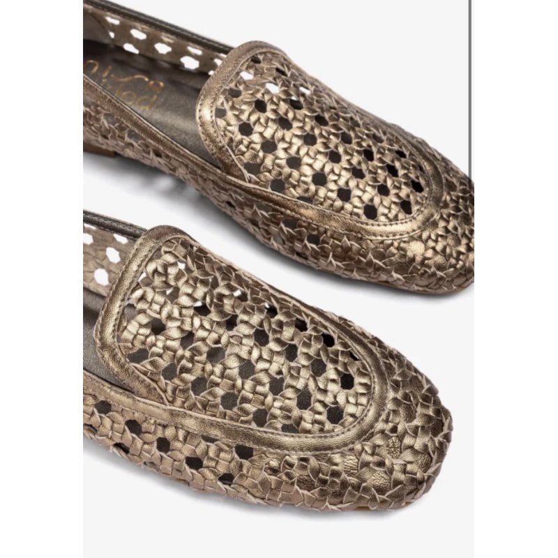 Flot og elegant loafer fra Unisa, i håndflettet skind. Super fin og let til sommeren, både med bare fødder og en lille strømpe. Skoen har en flot farve, som både kan skinne guld og bronze.