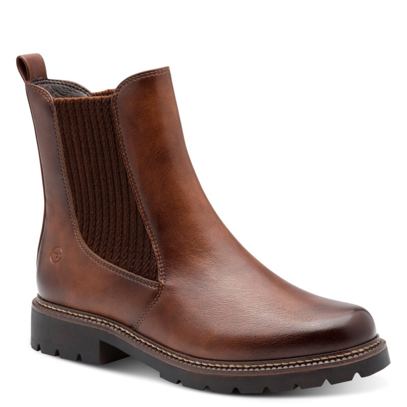 Den populære ankelstøvle model fra Tamaris, i en cognac brun imiteret skind. Støvlen har elastik i siderne, og en meget blød gummisål.