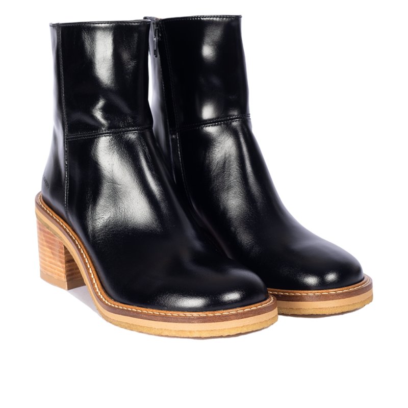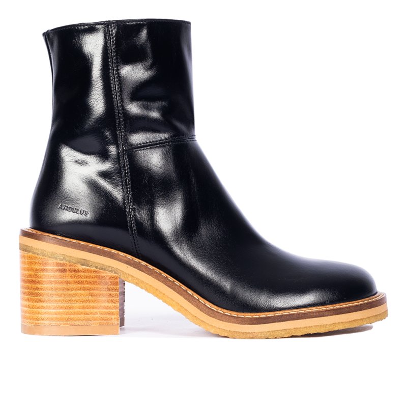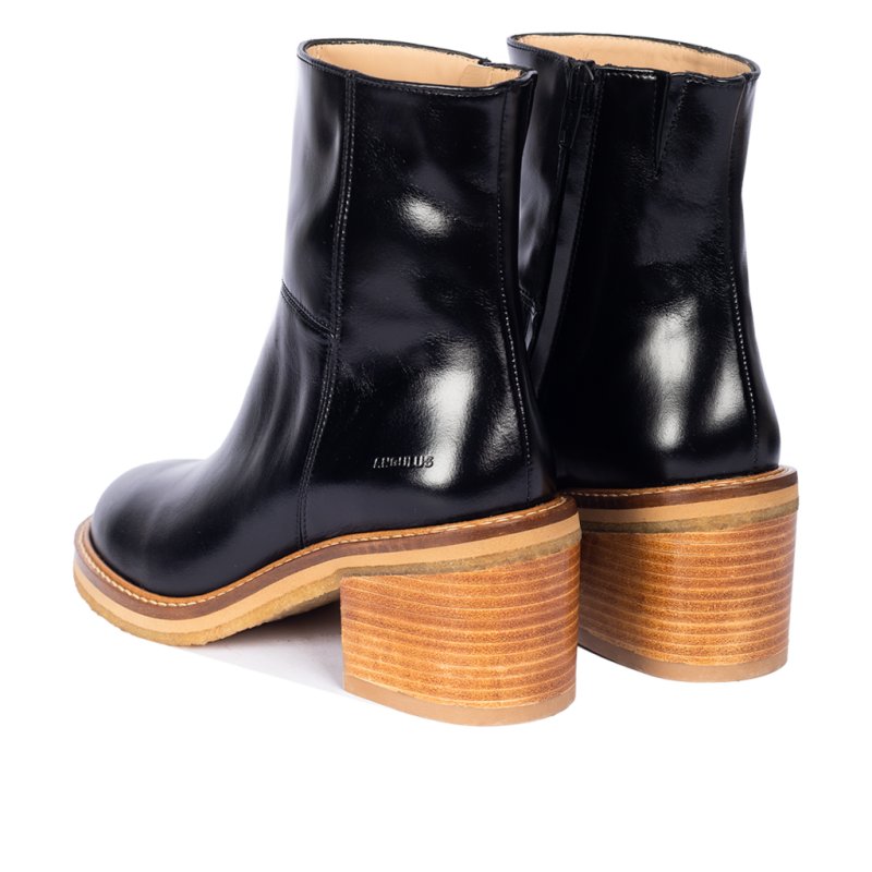 Den meget populære støvle fra Angulus, i sort glat skind, med en komfortabel bred træhæl. Snuden er en anelse rund, og har plads til fødderne. En TOP SELLER model fra Angulus. Støvlen har rågummisål på det forreste stykke.