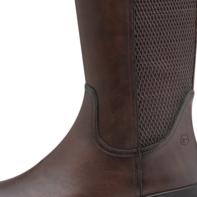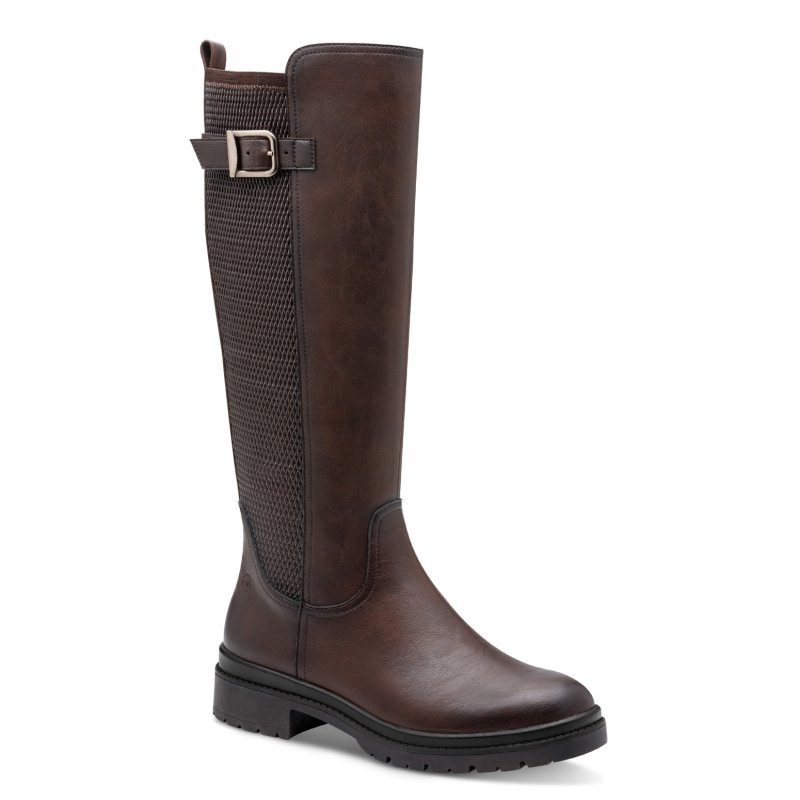 Meget lækker langskaftet støvle fra Tamaris i mørkebrun skind. Støvlen har gummisål, og lynlåse hele vejen igennem på indersiden. Fede detaljer bagpå, samt et lille spænde.