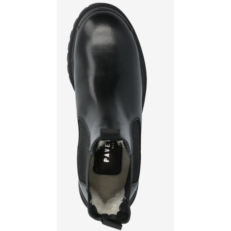 Lækker vinterstøvle fra Pavement i sort skind, med uldfoer indvendigt. Støvlen har elastik i begge sider, og en grov gummisål. Rigtig smart støvle, med en fantastisk komfort